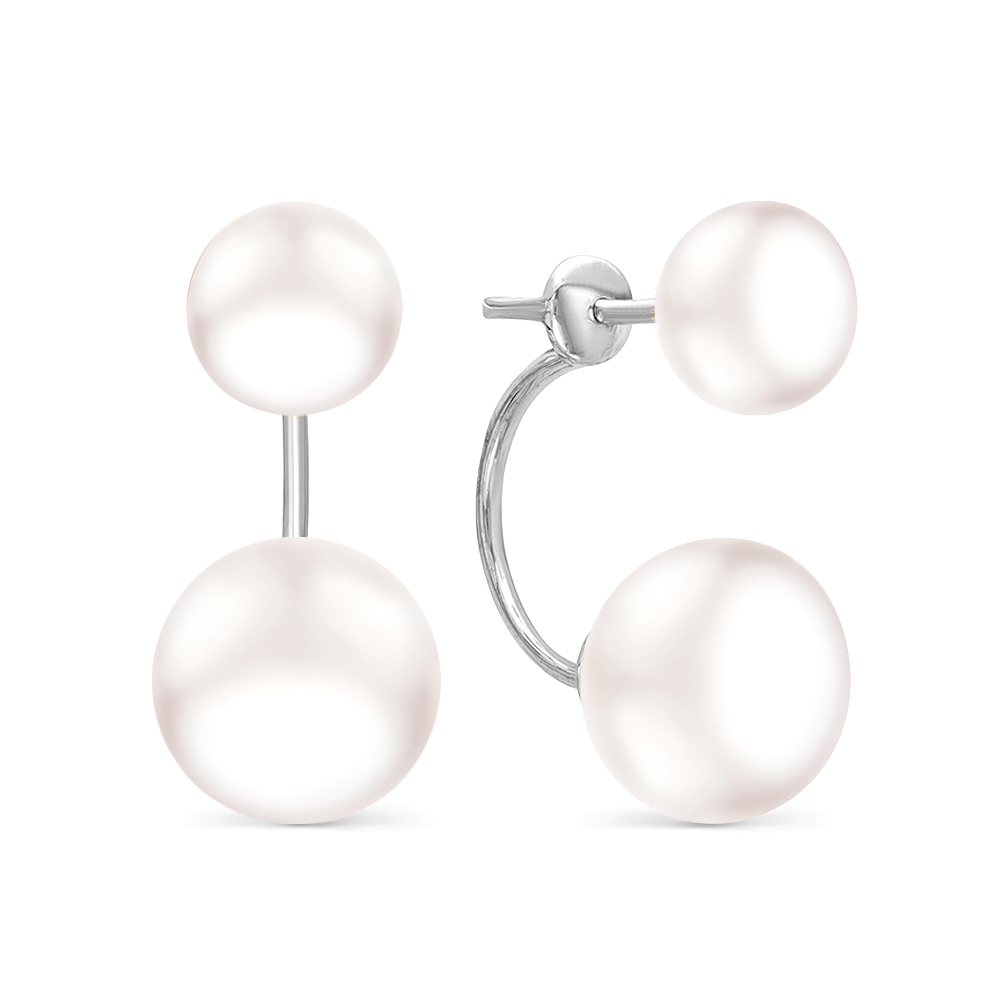 Двойные пусеты из серебра 925 пробы украшены белым пресноводным жемчугом. Форма жемчужин - "пуговица" (сплющенная), блеск перламутра очень яркий, качество жемчуга очень высокое.